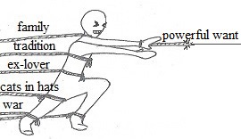 Of course, even if there’s no opposing string to your character’s desire, that just means there’s no internal tension stopping your character from pursuing their goals. The outside world might have different ideas! External forces are often the main opposition to characters with strong forward tension. This means the character might want something really badly, but the world is acting to counter it. External forces can also create consequences that shape some of the strings of sideways tension.