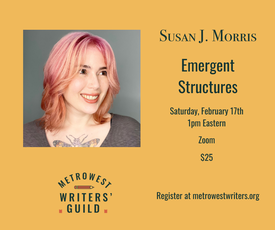 Image Text: Picture of a smiling white woman with pink hair and a bee tattoo. Susan J. Morris, Emergent Structures, Saturday, February 17th, 1pm Eastern, ZOOM. $25. Register at metrowestwriters.org. Metro West Writers’ Guild.